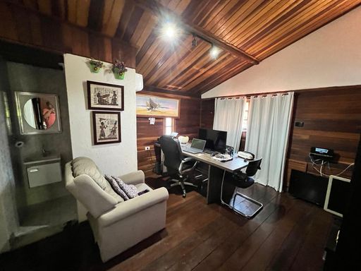3º pavimento: mezanino espaçoso, com ambiente de estar, escritório espaçoso reservado, banheiro e varanda com vista livre para o verde. Um ótimo home office.